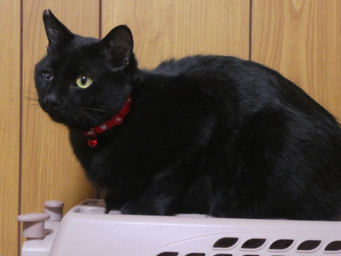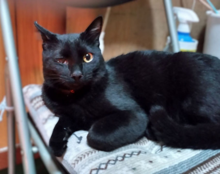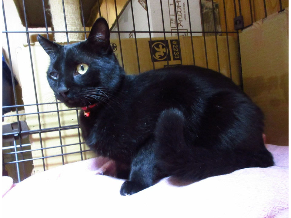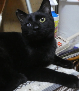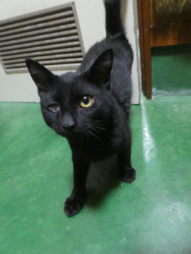全身真っ黒な男の子です。まっすぐで長いシッポ。右目は小さい時にかかったネコ風邪の影響です。少しは視力があると思われます。室内飼いにはまったく支障ありません。保護猫のため手術済みの耳先カットがあります。