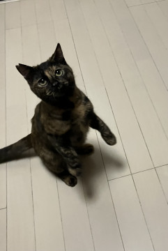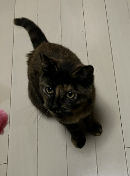 とても綺麗な黒の多いサビ猫ちゃんです。お目目は瞑らない瞳で吸い込まれてしまいそうです。尻尾は長くて真っ直ぐです、グリーンの綺麗な目です。とても穏やかで飼いやすい猫ちゃんです。1匹でも猫ちゃんのお友達にも良いと思います。