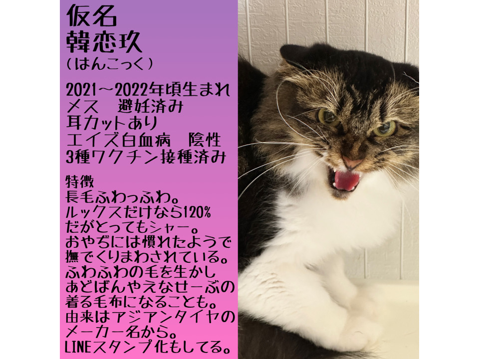 ※2025年10月30日をもって秘密結社から保護猫シェルターおうちにおいで。様へ移籍となりました。今後の応募に関しては実際におうちにおいで。様へご来店の上、里親希望をお願いいたします。