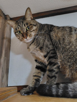 瞳の色はグリーン系です。しっぽはストレートでしましまで長いです。