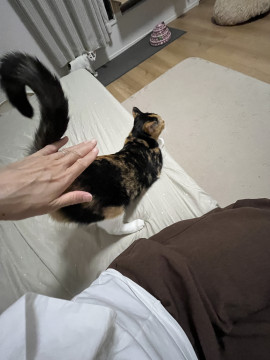 怖がりなので急に触ると怒りますが、他の猫がグルグルと人に甘えている様子を見ると、いそいそと近くまでやってきたり、すり寄ったり、傍でゴロンと転がって、ナデナデを要求します。