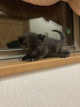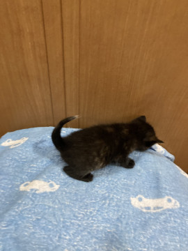 サビ柄の子猫ですが、全体的に黒っぽくお腹辺りに茶色が混じっています。右目下やアゴ辺りが薄茶になっていて、また尻尾の先がやや白いです。
