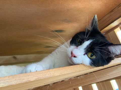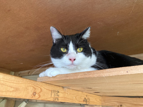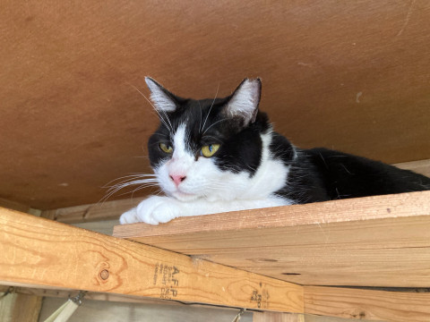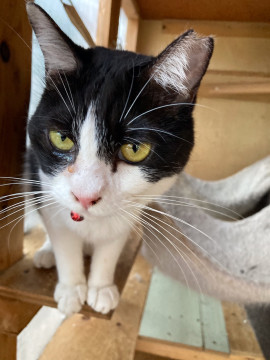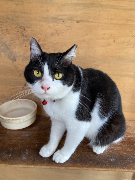 尾っぽが短い、きれいな八割れ白黒ちゃんです