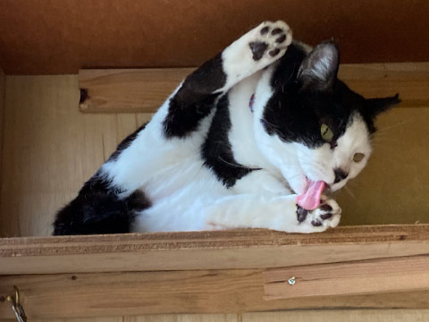 他の猫ちゃんが小屋から飛び出したら、一緒に出ていき、なかなか捕まえられません