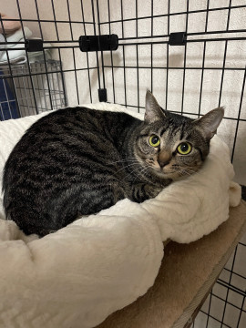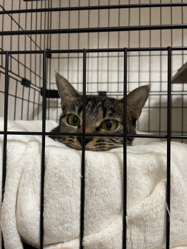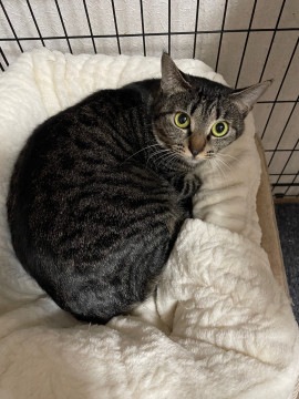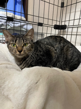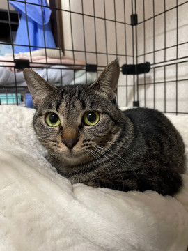 キジトラ柄の女の子で体重は約3.5kgと小柄で尻尾はまっすぐです