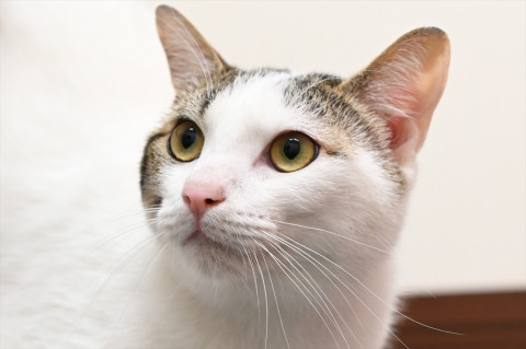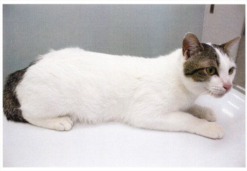 日本猫(キジ白) しっぽがキジ猫らしく縞々になっていて、先まで縞々なのが“まりと君”です。兄弟のうち、男の子は、前髪のように見えるキジ模様がアシンメトリーなのですが、まりと君は、右側だけパトラ様の目尻になっています。わずかにグレーがかったキジ模様です。背中のキジ模様が少なめです。