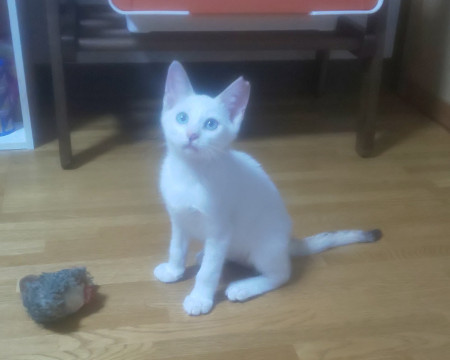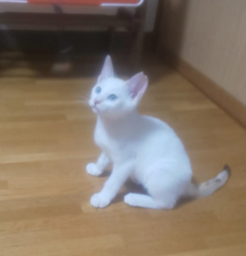 しっぽだけ三毛猫というかわった模様のブルーアイのモスラちゃんです。