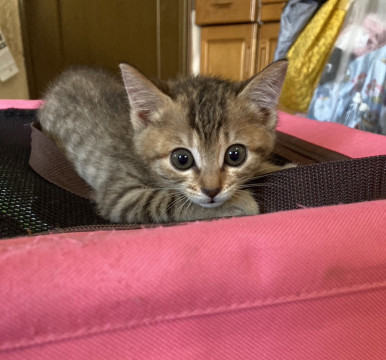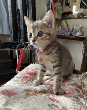 綺麗な縞模様のキジトラちゃんです。尻尾も長くて綺麗です。瞑らな瞳のとっても可愛い子猫です。猫ちゃんのお友達にもピッタリです。また1匹で飼われても大丈夫です。