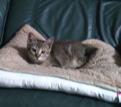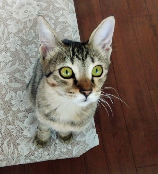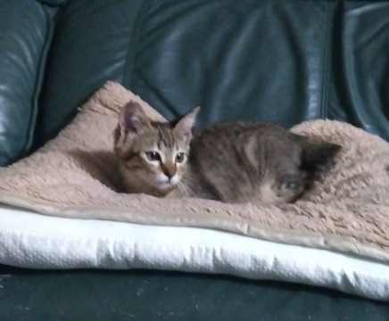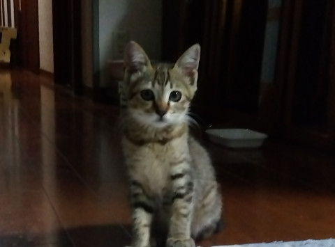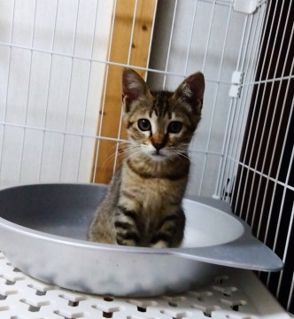 保護初日にトイレとベッドの区別が 出来た非常に賢い子。 食いしん坊。カリカリもウェットも スープも大好きです。大人猫並みに良く食べます。