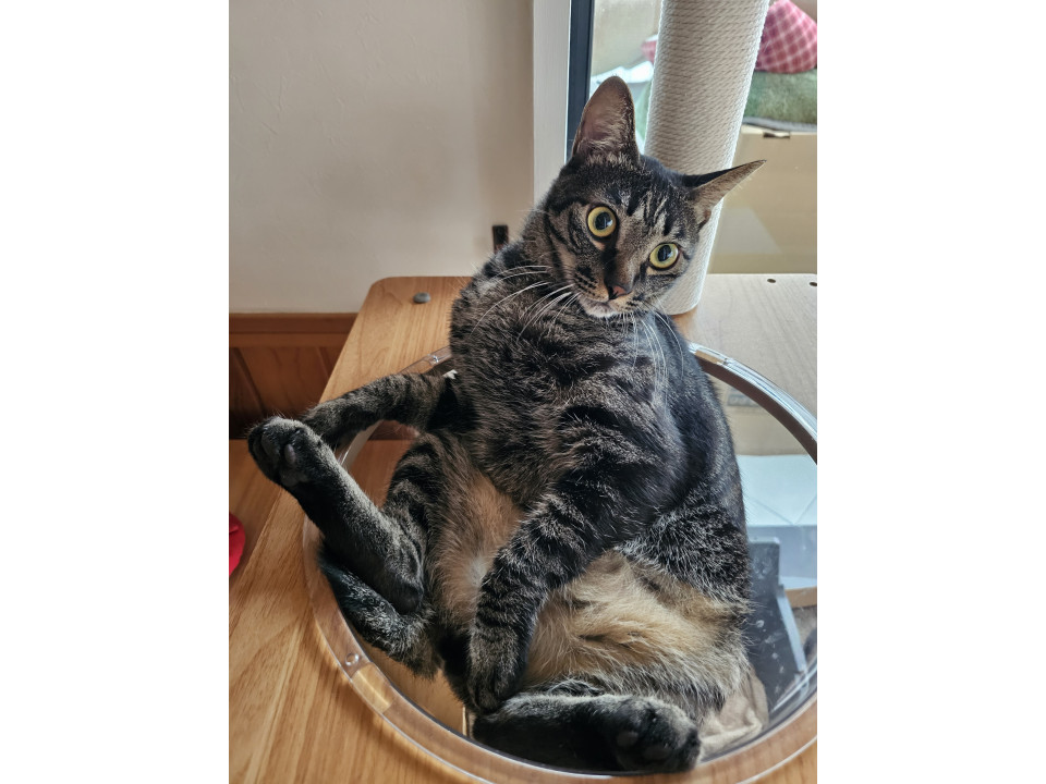 黒が濃いキジ柄でがっちり体型、ブラッシングが好きです。