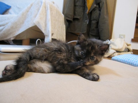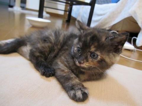 ややおっとりした性格。なでられると小さくてもちゃんとごろごろ言いますし、膝に乗るのも大好きです。人にも猫にも臆することはありません。