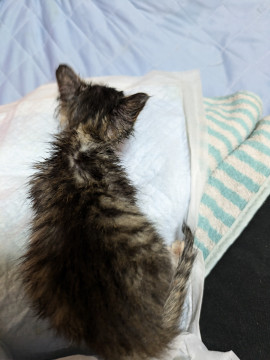 まつりちゃんは、引き出し当初は、一番小さくて、上手に御飯を食べられず、全身ビショビショになりながら、一生懸命に食べていましたが、今では膝に乗り、シリンジミルクを楽しみにしていて、その後も、上手に御飯を食べています。