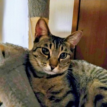 代表的なキジトラ模様で、背中やお腹周りは丸いヒョウ柄が特徴です。凛とした表情がたまらなく可愛い子です!