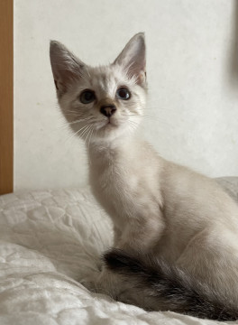 尻尾を立てて元気に動き回っております。人馴れ猫なれ抜群。鳴き声は掠れ声
