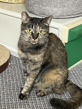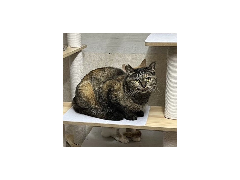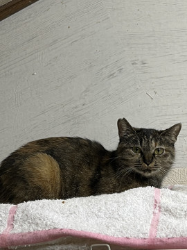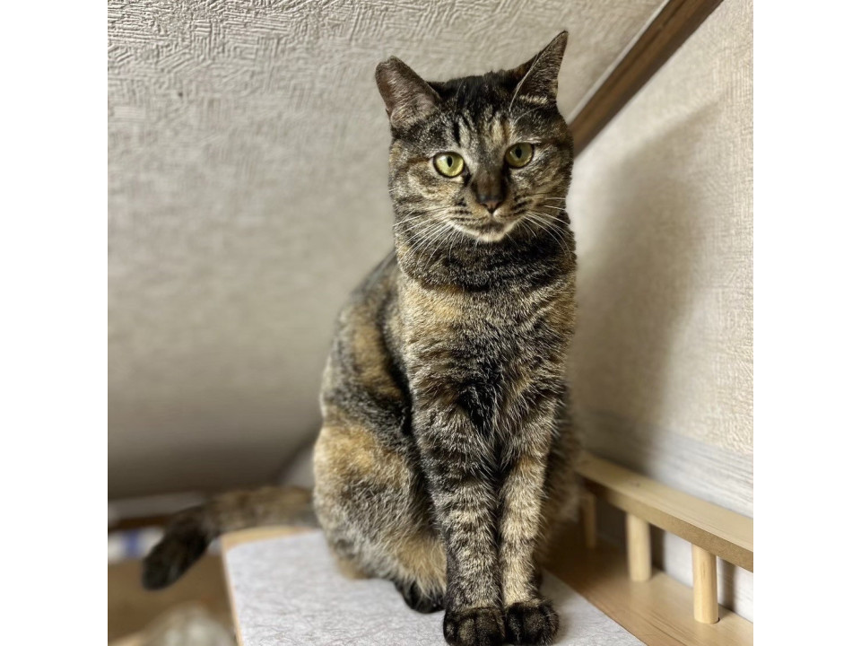 ○年齢不明(2025年1月時点で2歳以上)のムギワラ柄の女の子です。保護時の体重は2.3kgと小柄でスマートです。