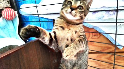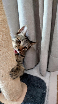 怖がりの面もありますが、ボール遊びや爪とぎなど、いちばん最初に遊び方を見つけます。活発な女の子です。