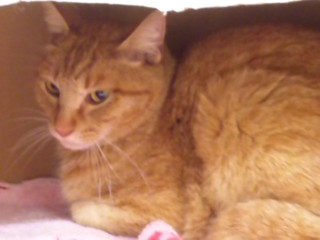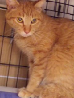 毛色は茶色です。昨年まで飼い猫だったので、人間大好きです。