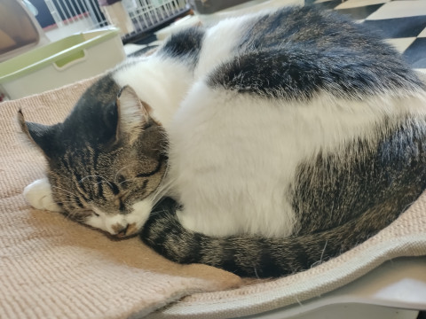 来客時などでも比較的落ち着いており、のんびりした性格な方だと思います。抱っこされたり、ブラッシングやおしりトントンなど、かまわれるのが好きなので、かまってくれる里親様を探しております。
