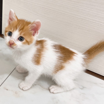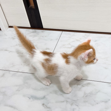 色は白ベースに茶色が入った模様、毛は短毛種です。