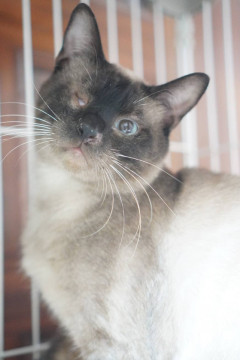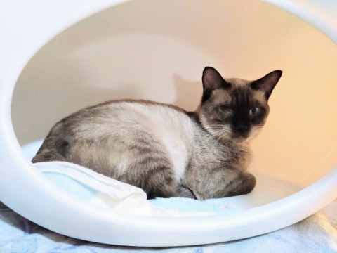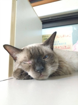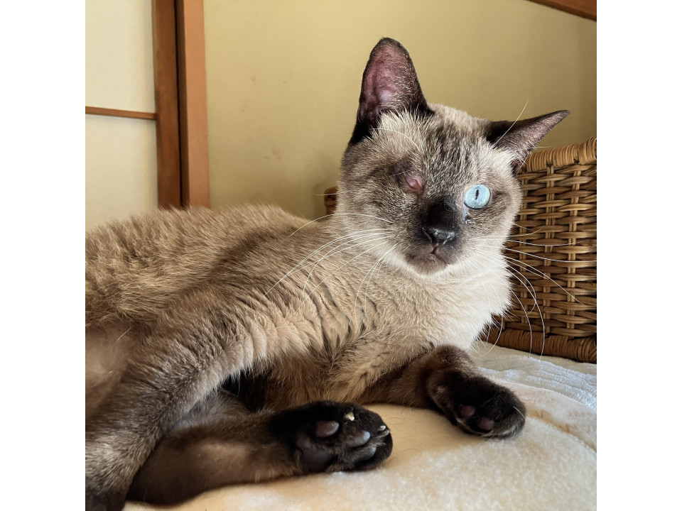 ○推定8歳くらい(2025年9月時点)の黒シャム風の男の子です。体重は4.4kg(2024年7月27日時点)です。