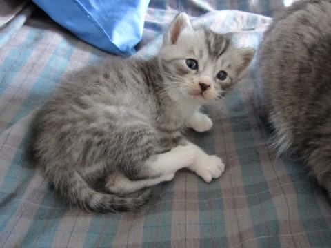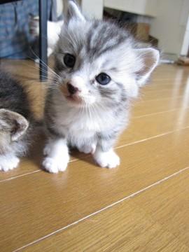 灰色の縞模様で手足が白く、優しい顔立ちの子猫です。上毛が長くシャムミックスなので長毛か半長毛になると思われます。かぎしっぽで、鳴き声が小さいです。性格はまだ小さいのでよくわかりませんが、ミルクから育てているので抜群に人なつこくなると思われます。