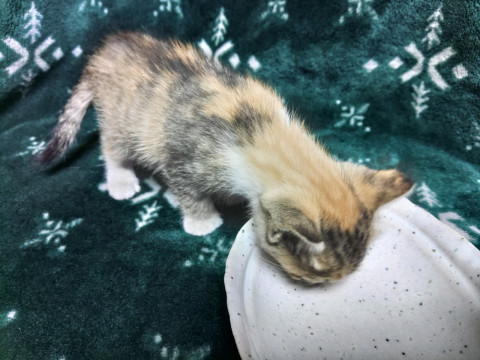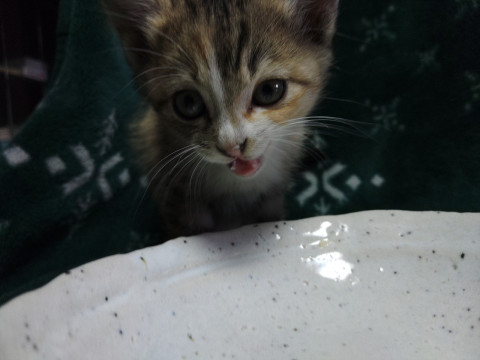 離乳は終わった様でカリカリなど成猫と同じ様な形状のご飯を一生懸命食べています。