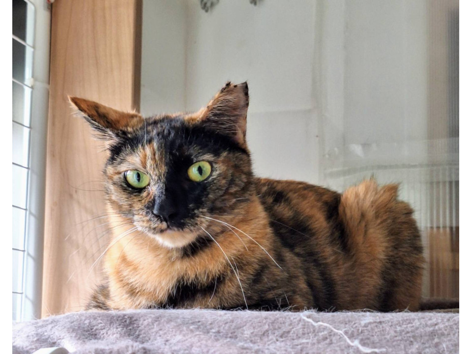 唯一無二の美しいサビ柄の女の子みたらしちゃん。お顔やお手手は半分黒が入っていたり、しっぽはトラ柄が入っています。