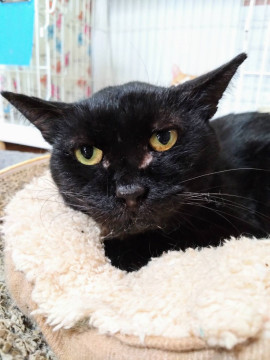○推定6-7歳くらい(2025年10月時点)の黒猫の男の子です。体重は3.4kg(2024/10/16時点)です。