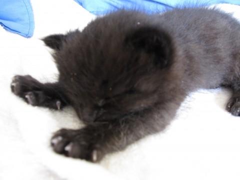 愛嬌のある黒猫で、うっすら縞があります。毛足が長いので成長するともこふわになると思われます。性格はまだ小さいのでよくわかりませんが、ミルクから育てているので人慣れ抜群に成長すると思います。