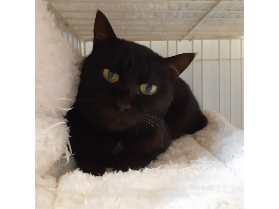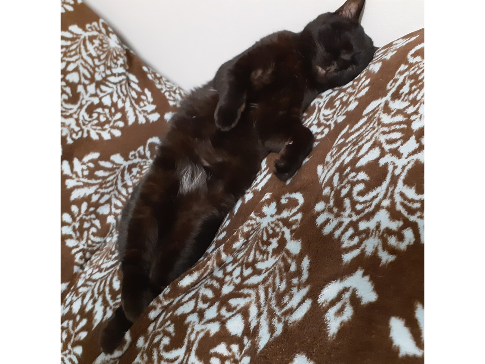 黒猫ですが赤毛が混じっていて、耳の中と喉、胸、お腹に白い毛が少しあります。