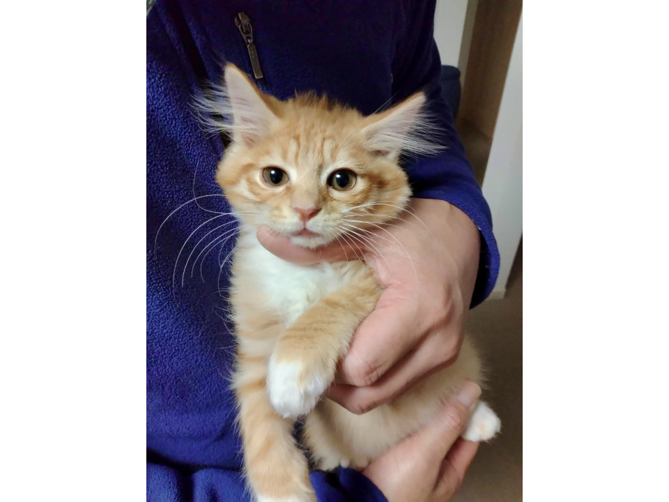 茶白の男の子。全体的にフワフワなので、長毛なのかもしれません。