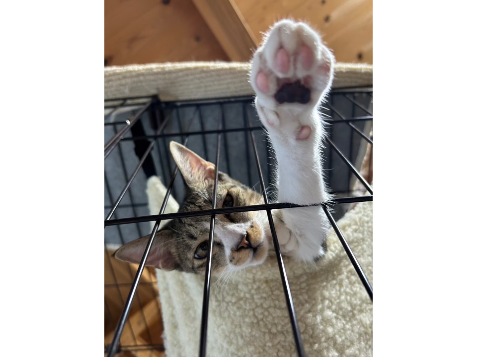 好奇心旺盛です。気になるものには前足でおいでおいでと気を引こうとするような様子がとてもかわいいです。