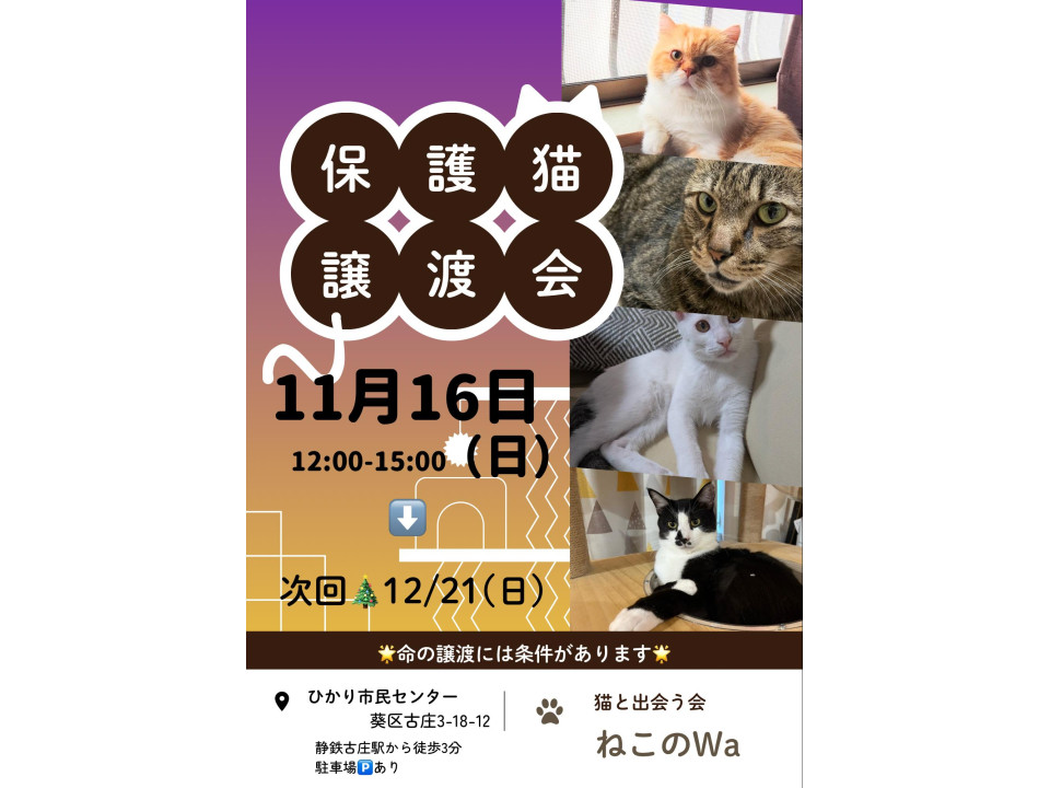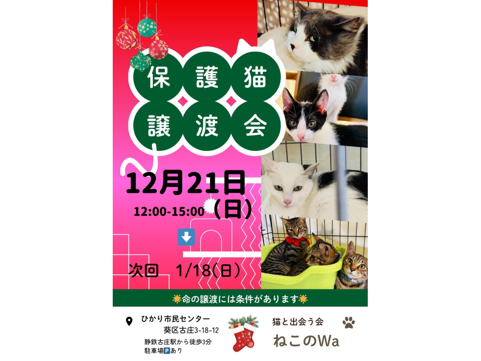 譲渡には条件等ございますが、たくさんの猫さん達が家族を待っております是非いらしてください。