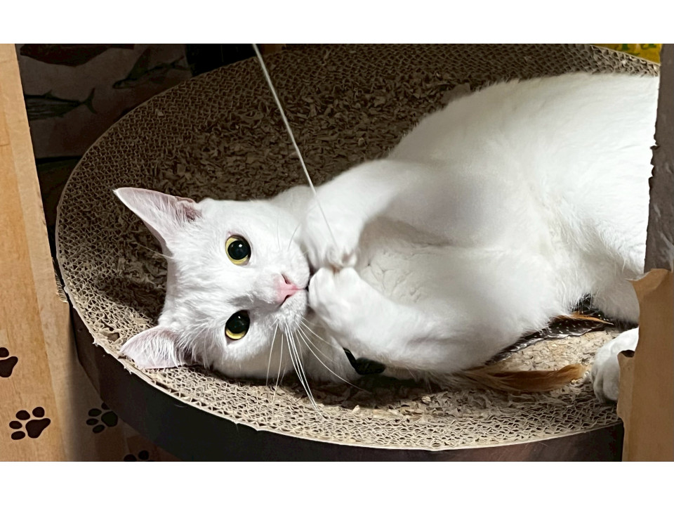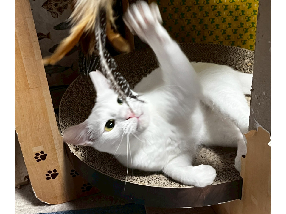 おもちゃで遊ぶのが大好きですが、成猫なのもあって子猫より精神的に落ち着いていると思います。
