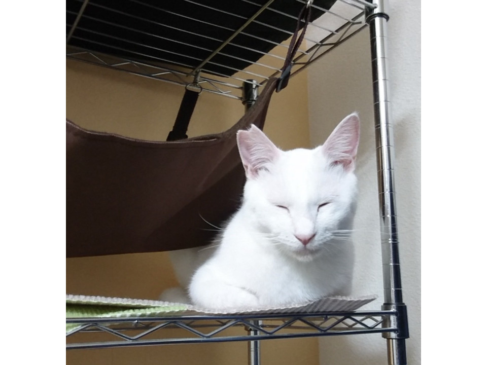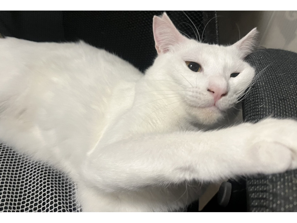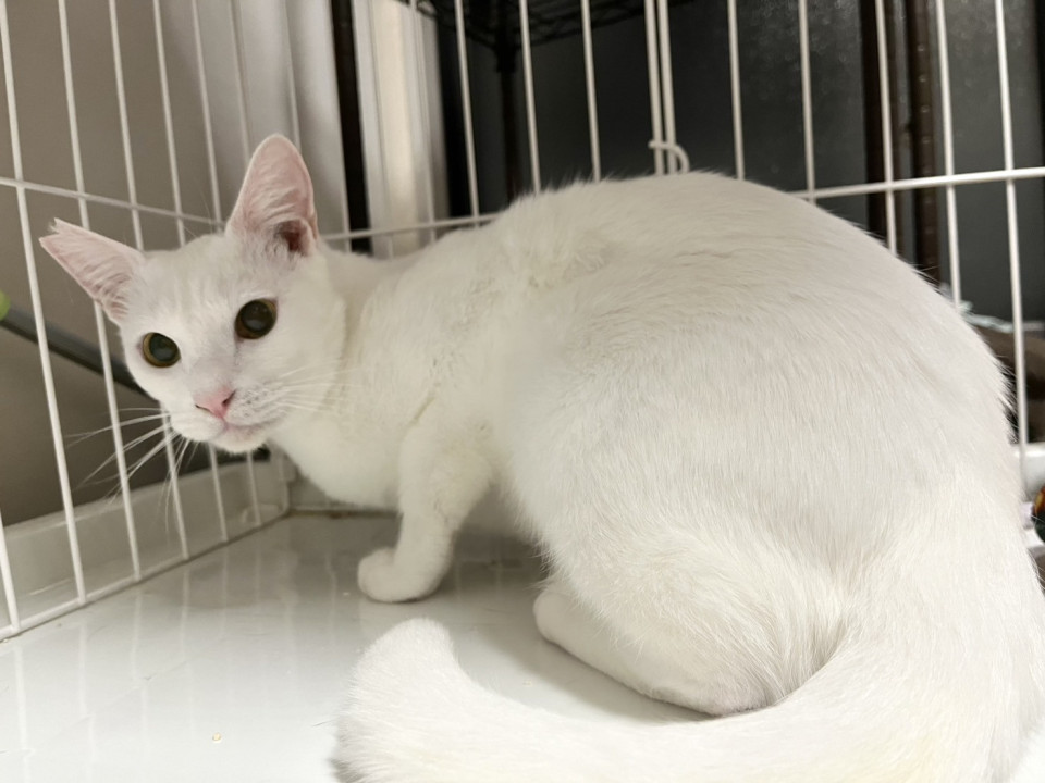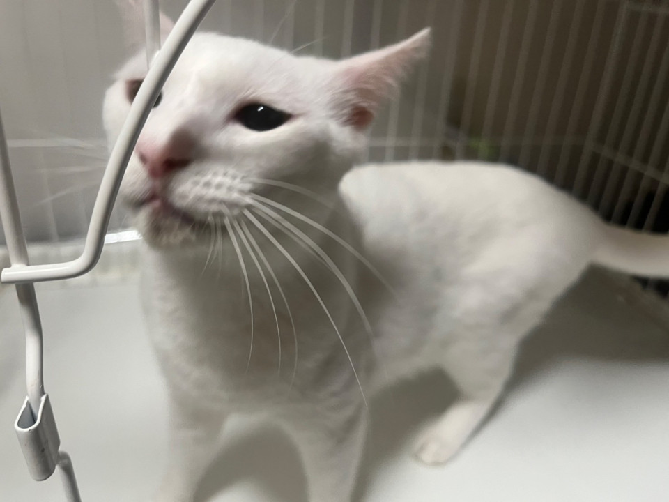 白猫です。2021年の春生まれのようですが、元保護猫のため詳細な生年月日は不明です。