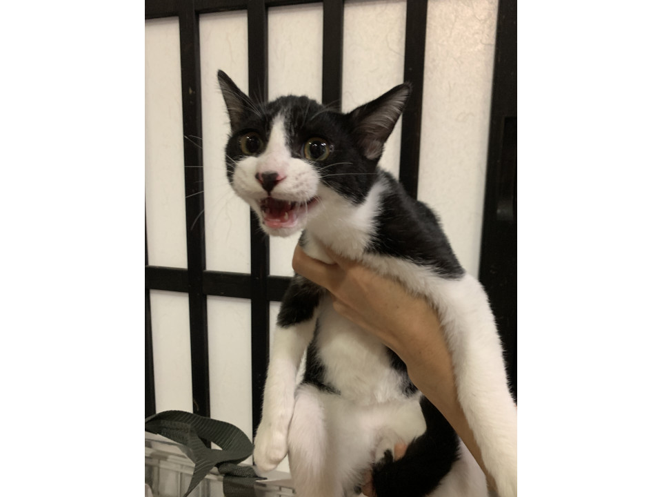 保護されたばかりで緊張気味の様子ですが威嚇や攻撃などなく撫でることもできます。