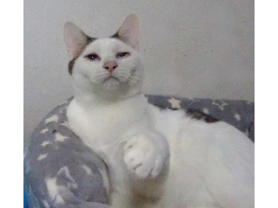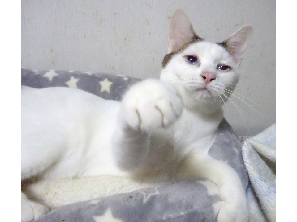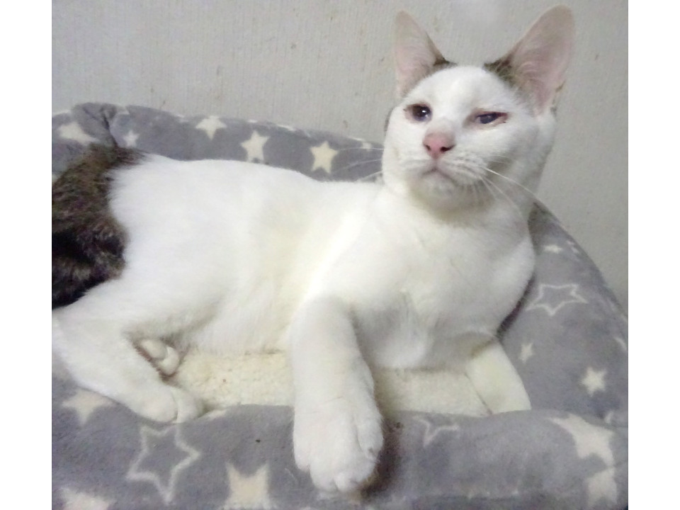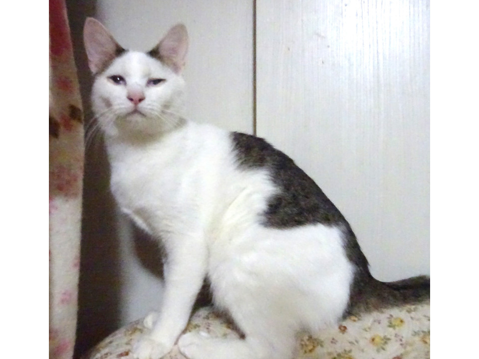 性格: 目の状態が悪く、殆ど見えない状態で来ましたので、人と接する時は目薬、飲み薬でしたから、人嫌いになるかと思いましたが人は好きみたいで、足元にスリスリしたり、肩に乗ったり、膝に来たりと甘えます。 抱っこも大丈夫ですが、長いと治療と思うのか、抱っこは短めが好きです。 兄弟も仲良しだし、他猫とも問題なく付き合えます。 目の手術をしてかなり見えるようになりました。眼球が大丈夫ですが、瞼などが委縮したため、小さくなってしまいましたが、見えていて生活に支障がないようですので、それ以上の手術はしていません。 お届けは千葉県内で、千葉市幕張から車で1時間位を希望します。