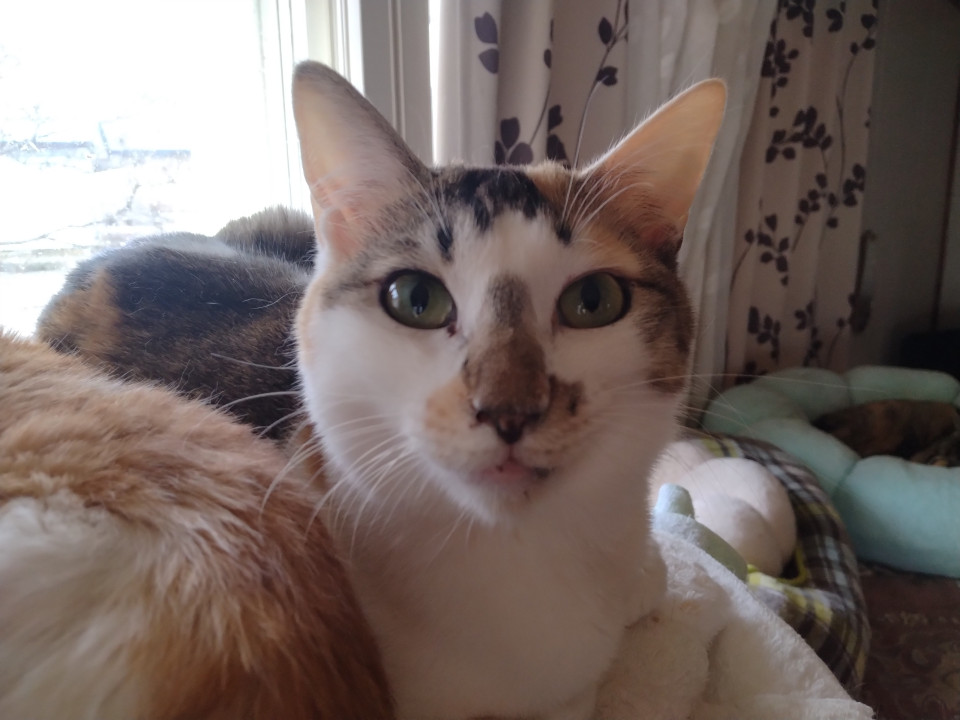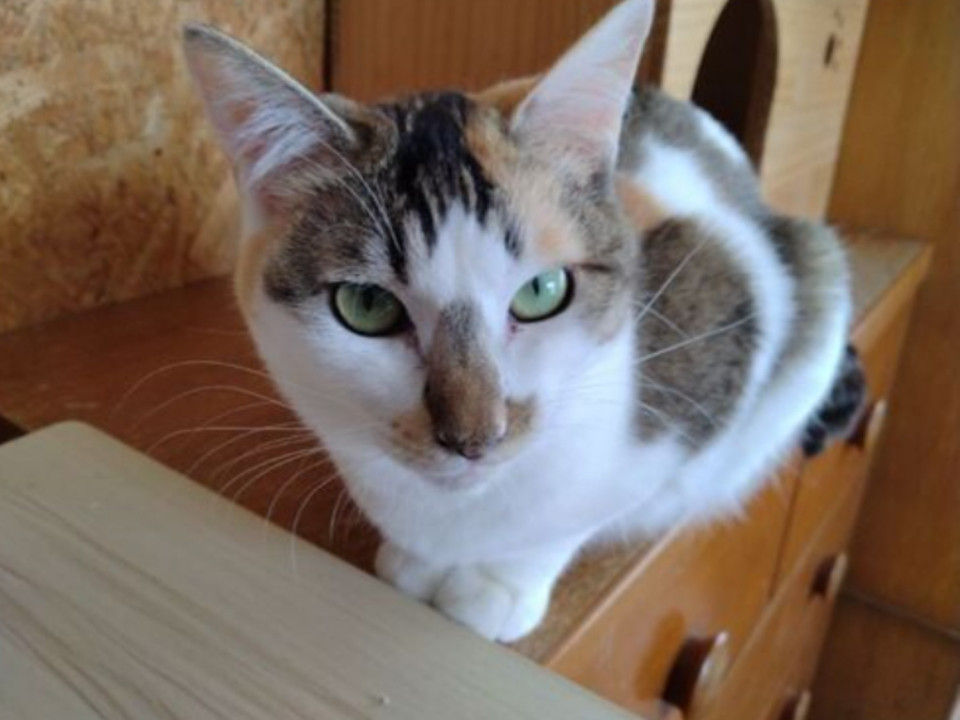 【性格】ちゅーるを催促してスリスリにゃーにゃー甘えてきます。抱っこは苦手ですが人懐っこい性格の良い子です。毛色の配色がとても綺麗な三毛猫のちゃんです。