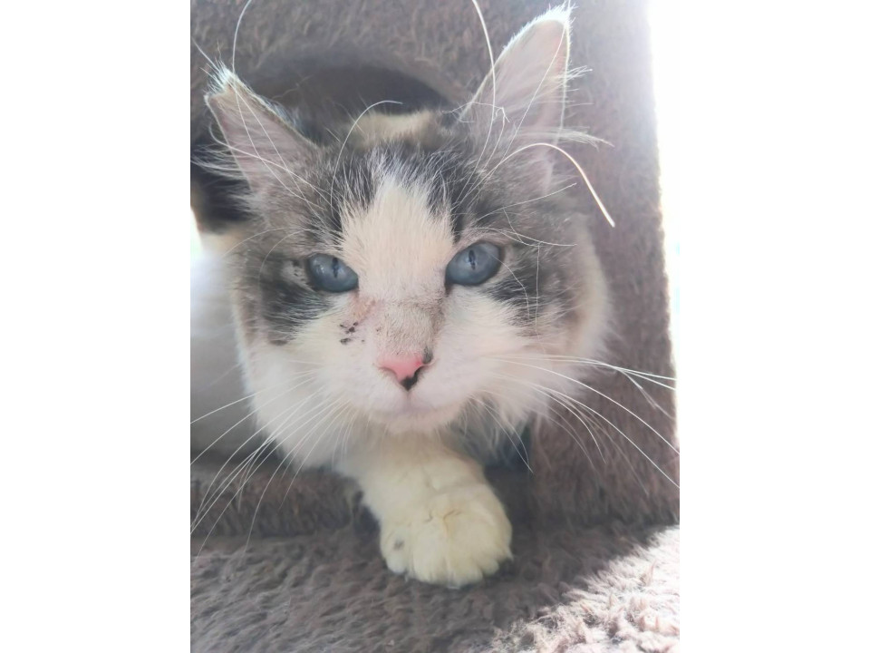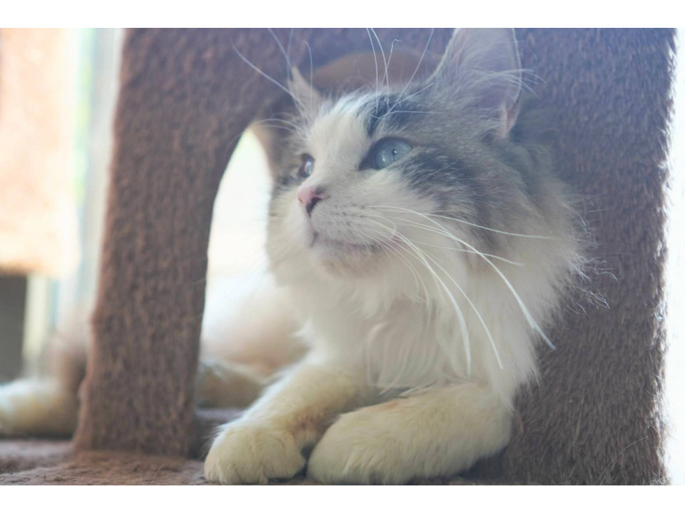 ○年齢不明(2025年4月時点で推定5〜6歳?)のグレー白ハチワレ柄の長毛の男の子です。体重は3.9kg(2025年4月6日時点)です。