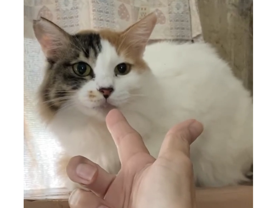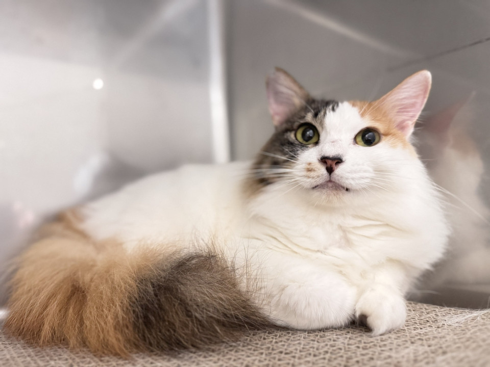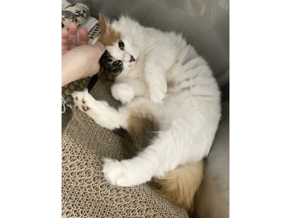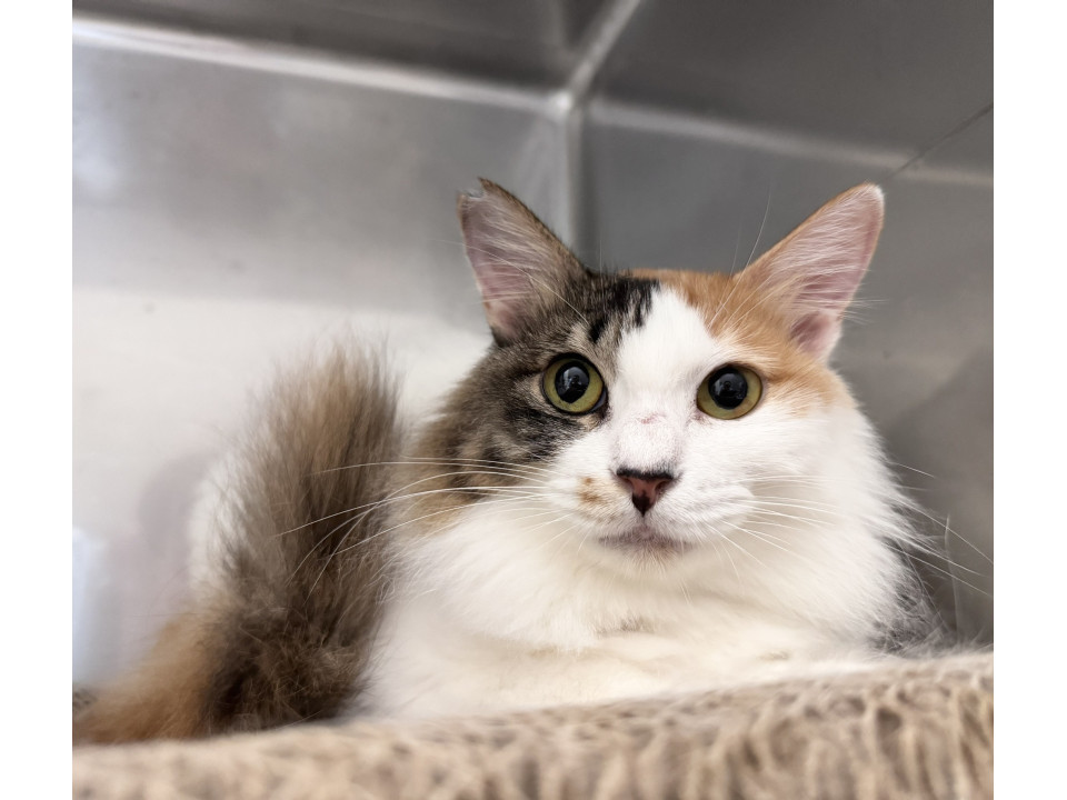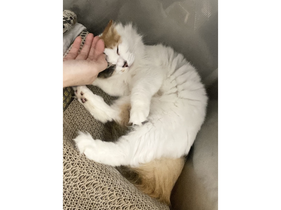 白が多めの三毛猫さんです。長毛さんなので洋猫さんの血が多少は混ざっているんだと思われます。白いもふもふのお腹に顔を埋めたくなります笑。こんなに綺麗な毛並みをキープするにはこまめなお手入れが必須です。ブラッシングが大好きな猫さんなので、スキンシップがてらブラッシングもぜひ楽しんでください。元地域猫さんなのでサクラ耳のカットになっています。