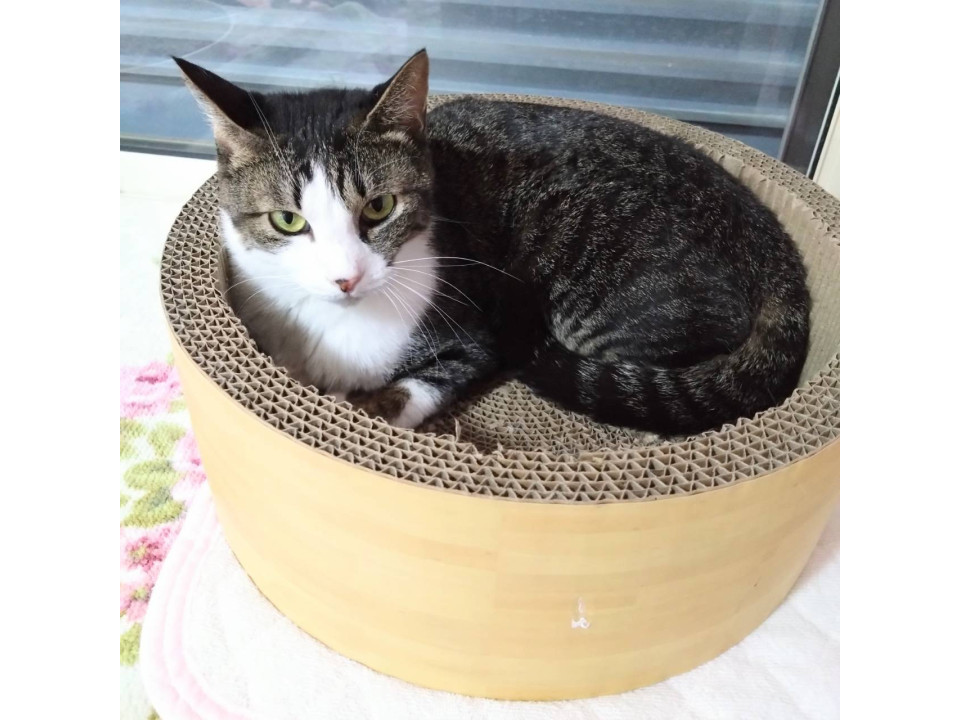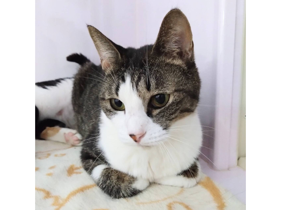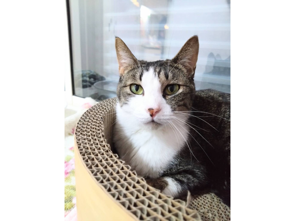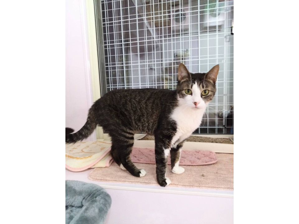 ○推定10歳以上(2025年5月時点)のキジ白ハチワレ柄の小柄な女の子です。体重は3.28kg(2025年1月14日時点)です。