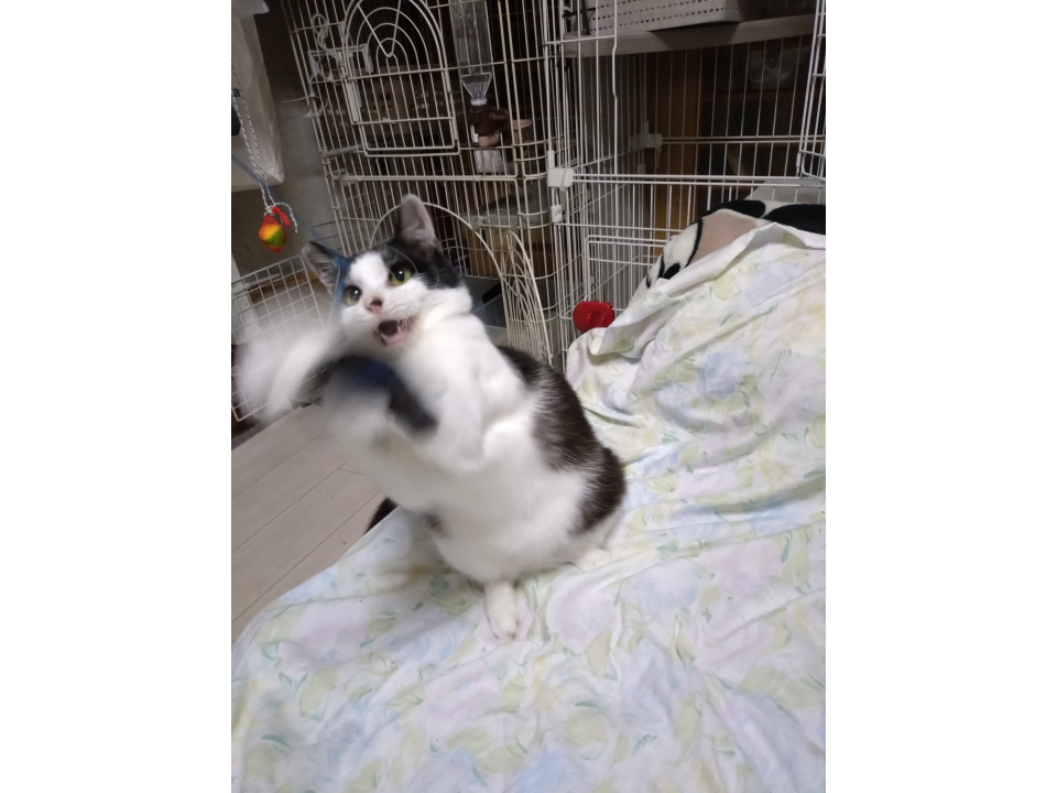 たぶん5才?くらいと思われます。じゃらしに反応すばらしく大はしゃぎです。