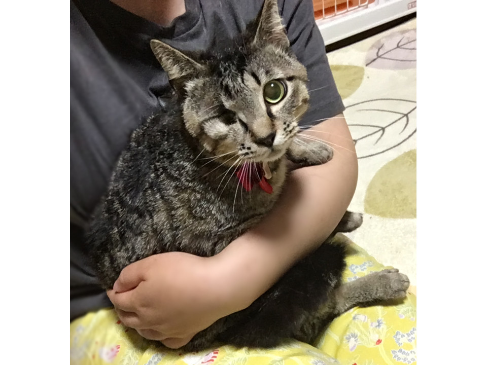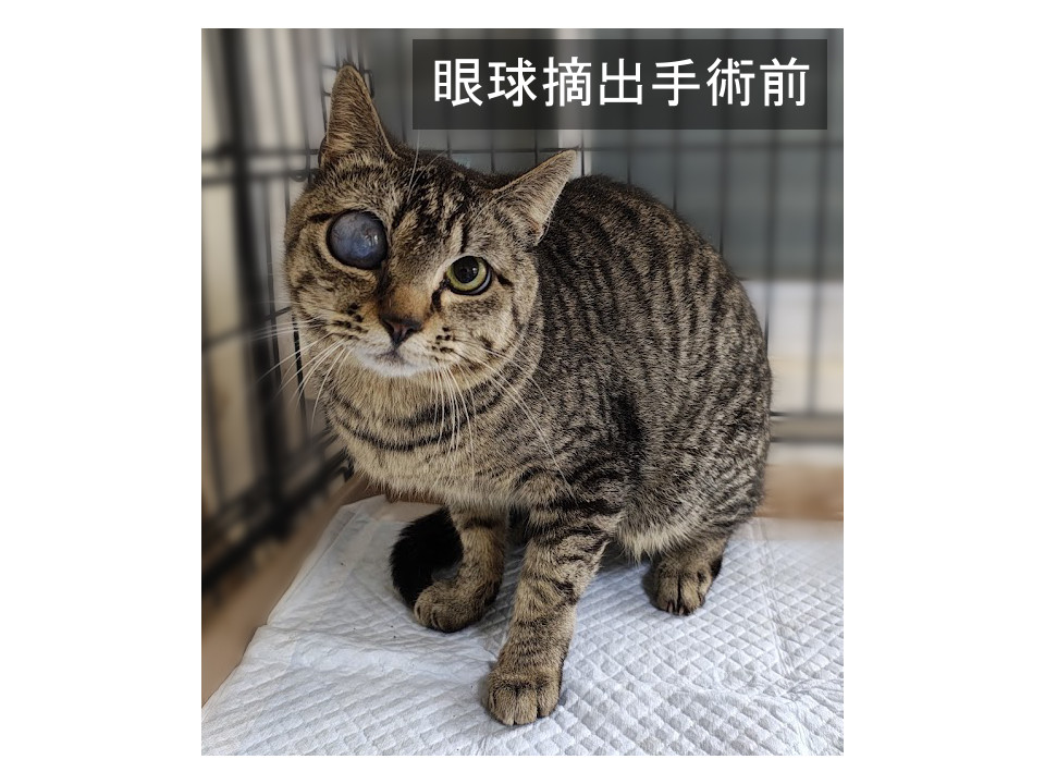 猫が繁殖している住宅地にてTNRのため捕獲しましたが、片目が飛び出ており治療が必要だったため保護となりました。