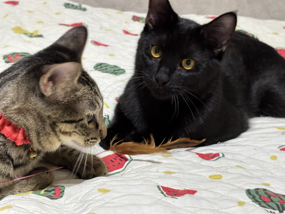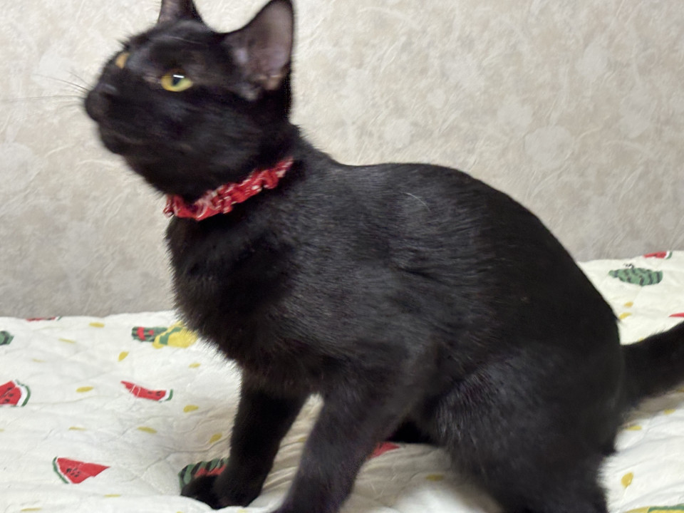 真っ黒な男の子です。愛らしい兄弟たち。大人しい控えめな子です。本当は甘えたくて一番に膝に来たり寄り添いたいのに順番を待っています。そんな姿は見ていて健気すぎます。お膝が独占できる日が待ち遠しです。猫じゃらしで遊ぶ時も優しいです。