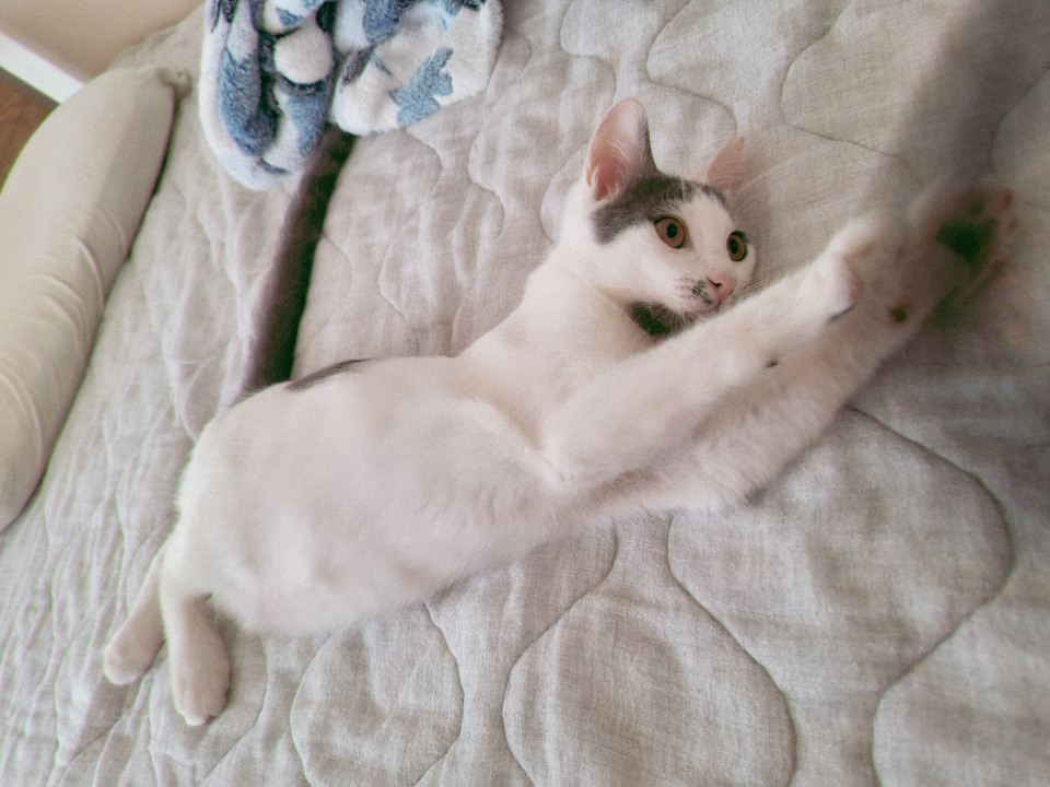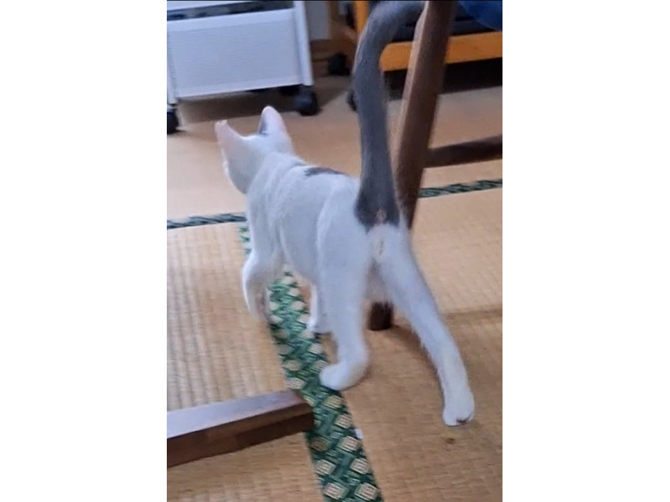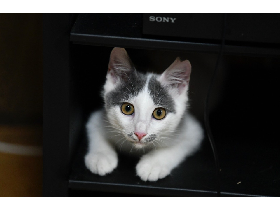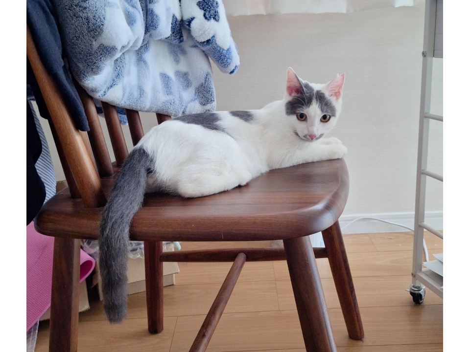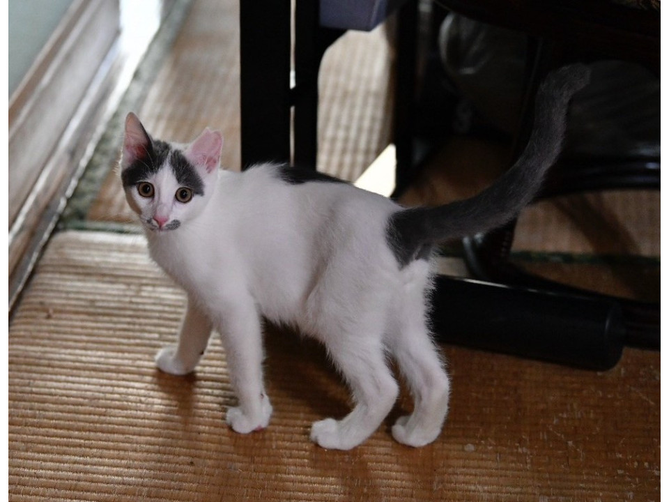 白地にグレーのブチ。ハチワレ。少し長毛。とてもかしこくて活発。遊ぶのが大好き。おもちゃを投げたら取って来たりします。ケージでお留守番できます。お腹の上で寝てくれます。やんちゃ盛りですが今は一緒に遊べる子がいないので、先住に同じ年頃の猫ちゃんがいればいいなと思います。