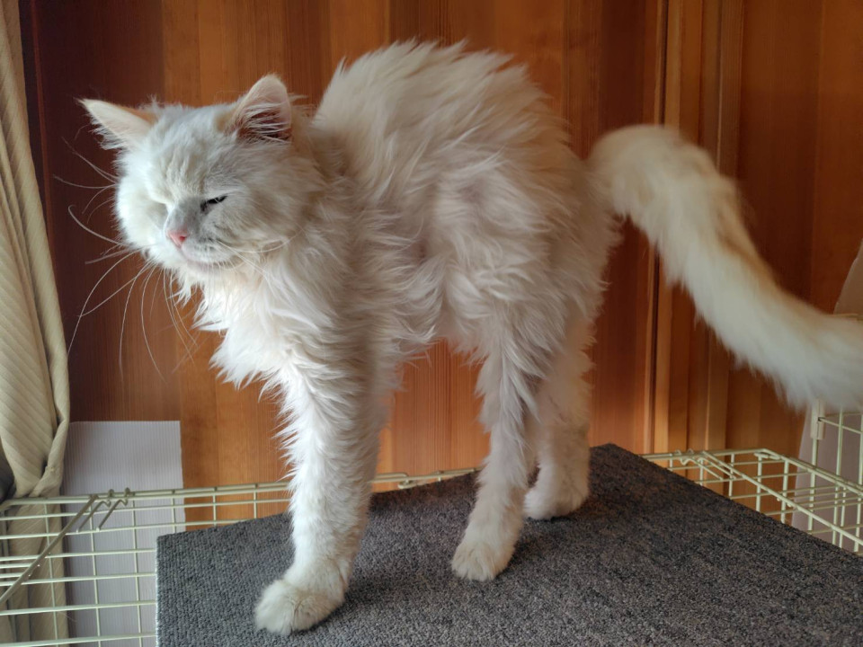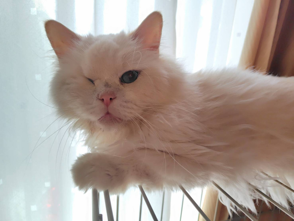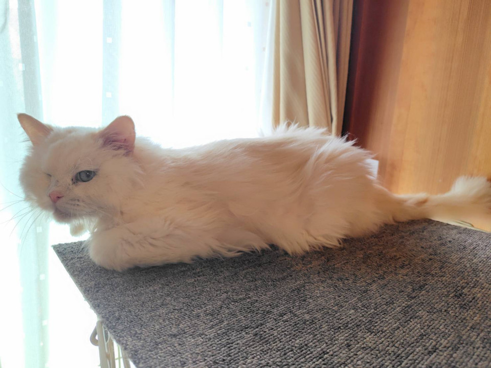 ○推定5-6歳ぐらい(2025年6月時点)の長毛の白猫です。