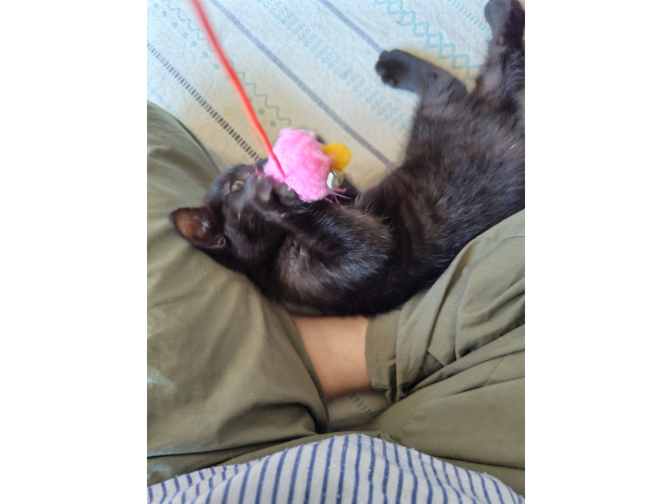 好奇心旺盛で遊ぶのが大好きで元気一杯。自分でおもちゃを持ってきます。猫も人も大好きで近づいてきてゴロゴロいいます。