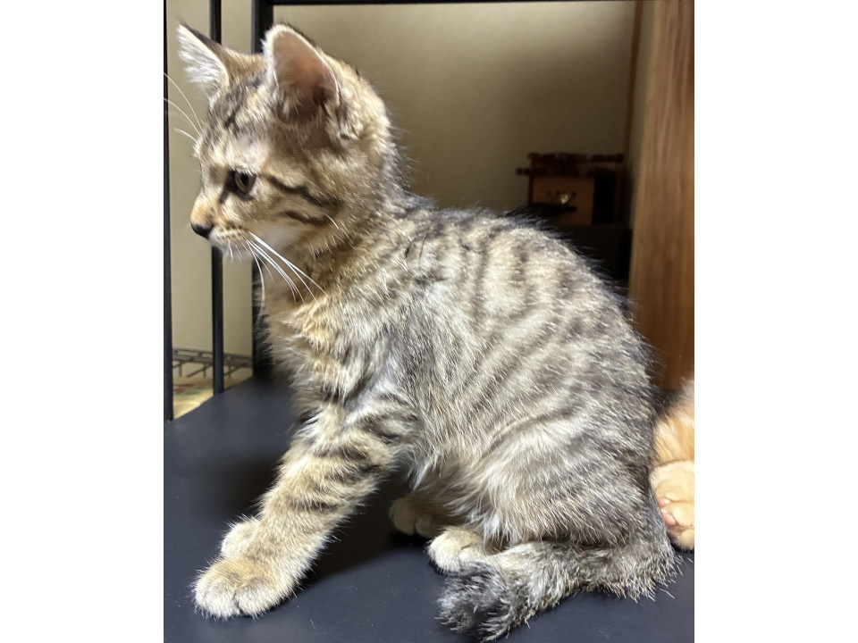 生後2か月程度と推測されますが、野良で生まれていますので、正確にはわかりません。