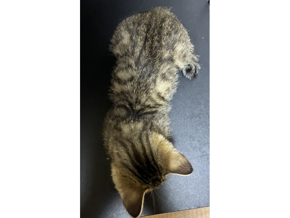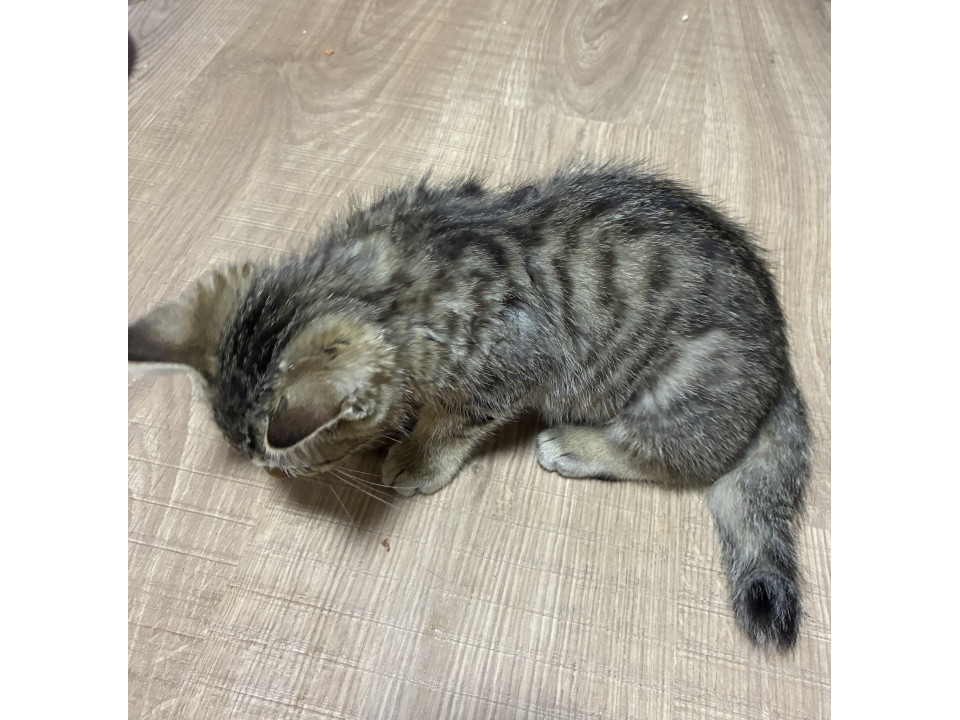 母猫が、4頭の子猫(1か月程度?)を連れて、地域を動き回っていましたが、車の往来もあること、また、周囲にはカラスなども多くみられるので、紆余曲折を経て最終的に全4頭を捕獲することができました。この子猫は、最後に保護した猫です。