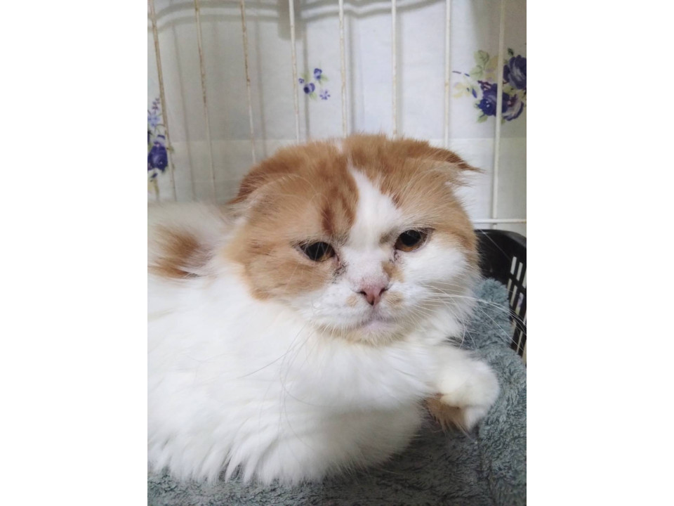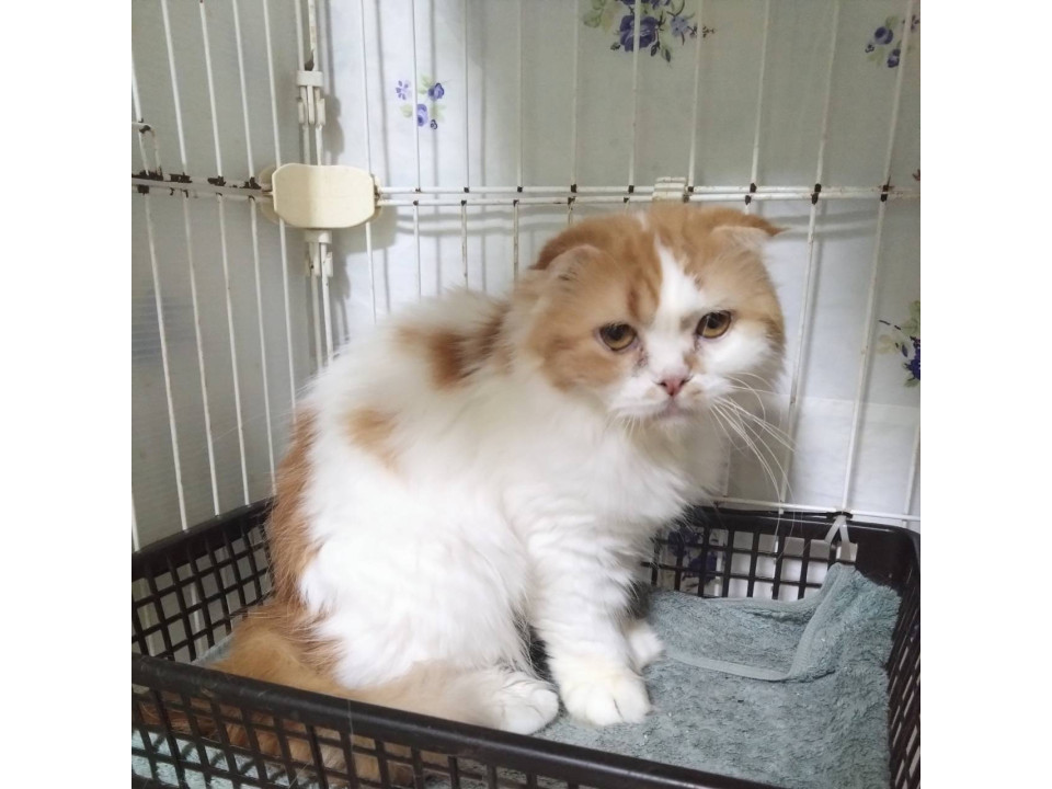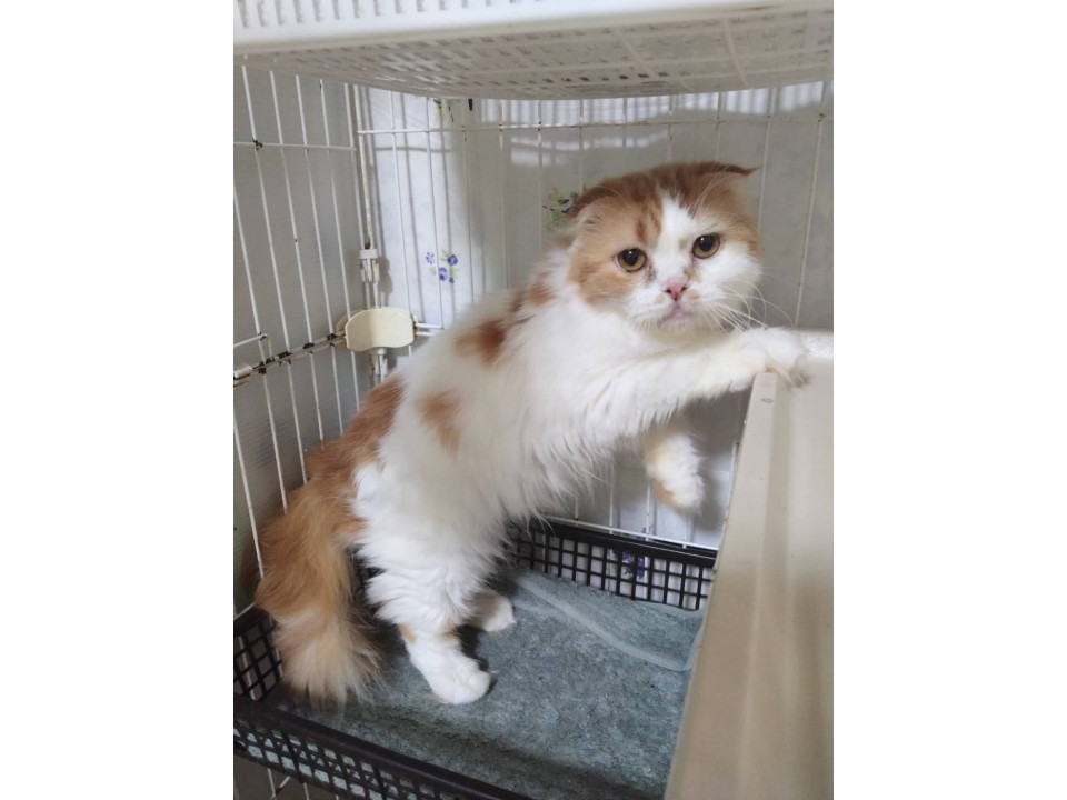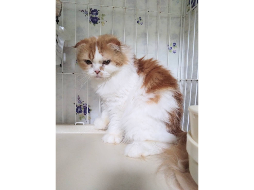 ○推定3〜5歳くらい(2025年7月時点)のスコティッシュフォールドの茶白の女の子です。体重は2.7kgくらい(2025年7月時点)です。